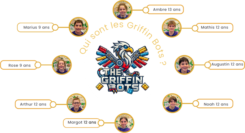 Nous sommes huit jeunes aventuriers de 9 à 13 ans, réunis sous le nom des Griffin Bots. Nous venons de la région orléanaise, plus précisément des communes de Chécy, Mardié et Bou. Notre histoire commune ne date pas d’hier : la plupart d’entre nous se connaissent depuis la maternelle !